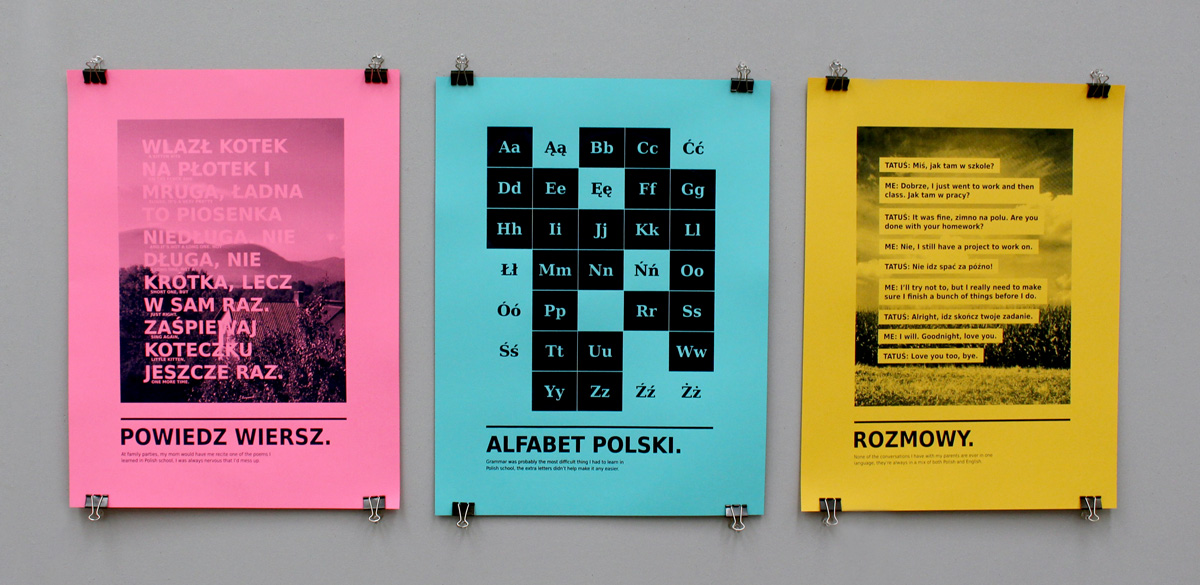 My parents were both born and raised in Poland and they chose to share this culture with me and my older brother. I created this series of posters with my biligual experiece in mind. In addition, my posters were featured on Ficciones Typografika, which is a project curated by Erik Brandt to explore typography exhibited in a public setting.